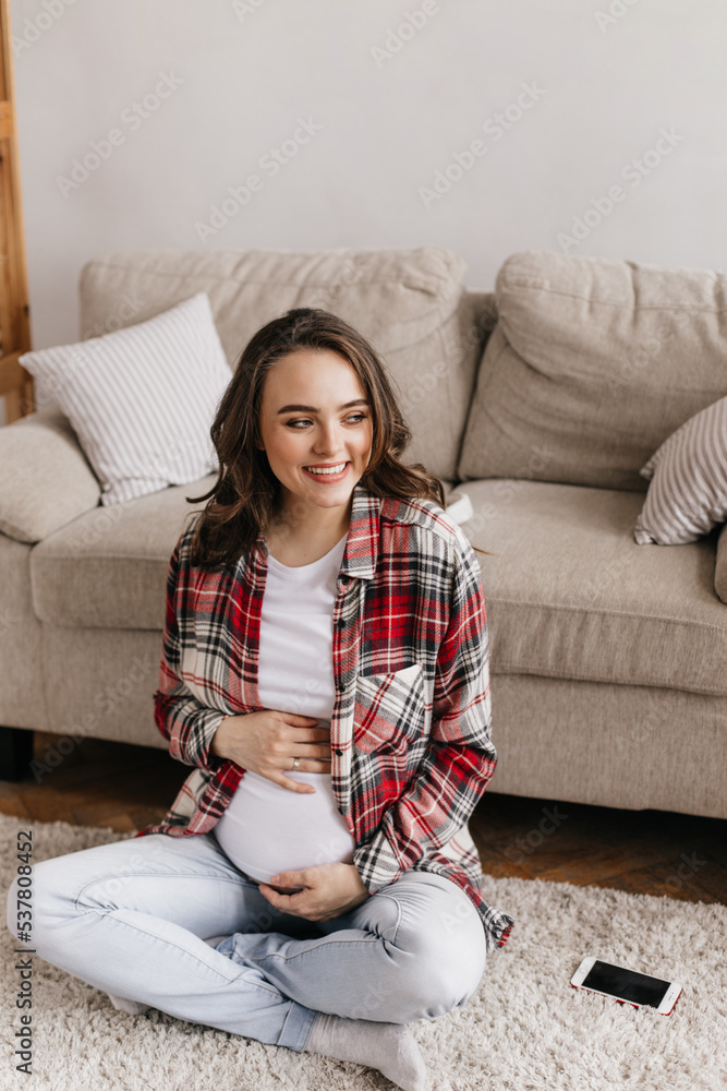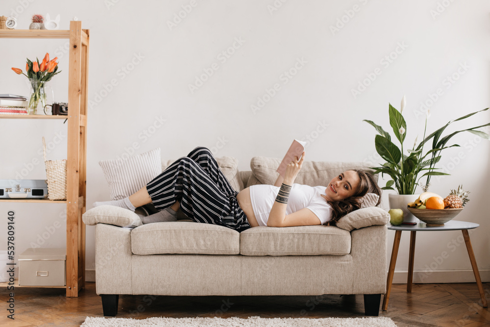 Charming brunette pregnant woman looks into camera and smiles. Happy girl in white tee and black pants read pink book and lies on beige sofa