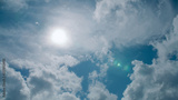 Bright sun's rays floating in a deep sea of clouds, beautiful sunny pastel unfolding across the sky. Amazing loveliness of nature scenery, warm of summer sunrise