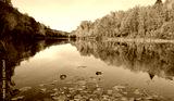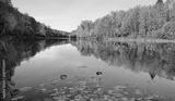 Beautiful colorful autumn landscape. River and yellow-orange bright autumnal forest in sunny day. fall season. harmony peaceful nature image. Pastoral scenery