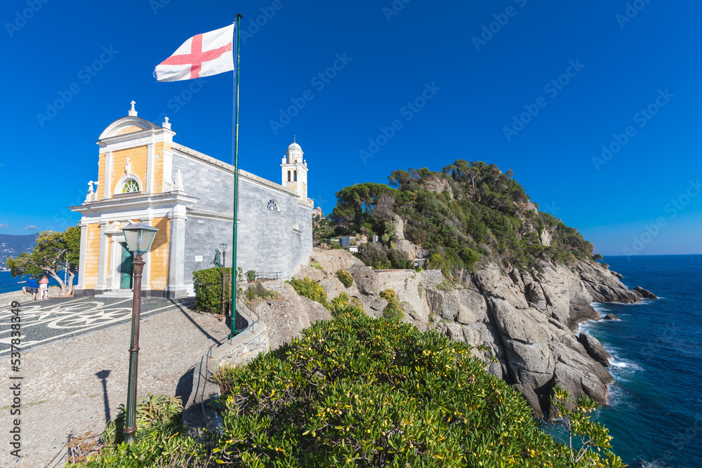 Portofino, Italy. October 20, 2017: Church of San Giorgio (Portofino). The church of San Giorgio is a Catholic worship site in Portofino, located on the San Giorgio slope. Rocky coastline and waves.