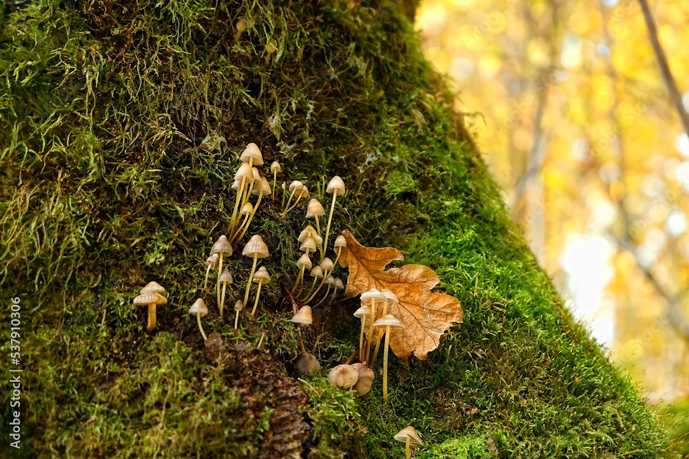 Small mushrooms growing on mossy tree stump close up, natural abstract forest background. mystery nature image. Autumn, Harvest season, mushrooms picking concept