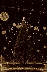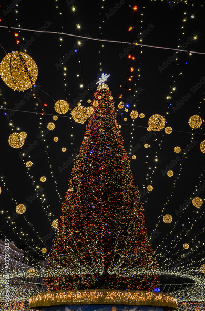 Christmas tree outdoor with holiday lights. New Year illumination in Kyiv