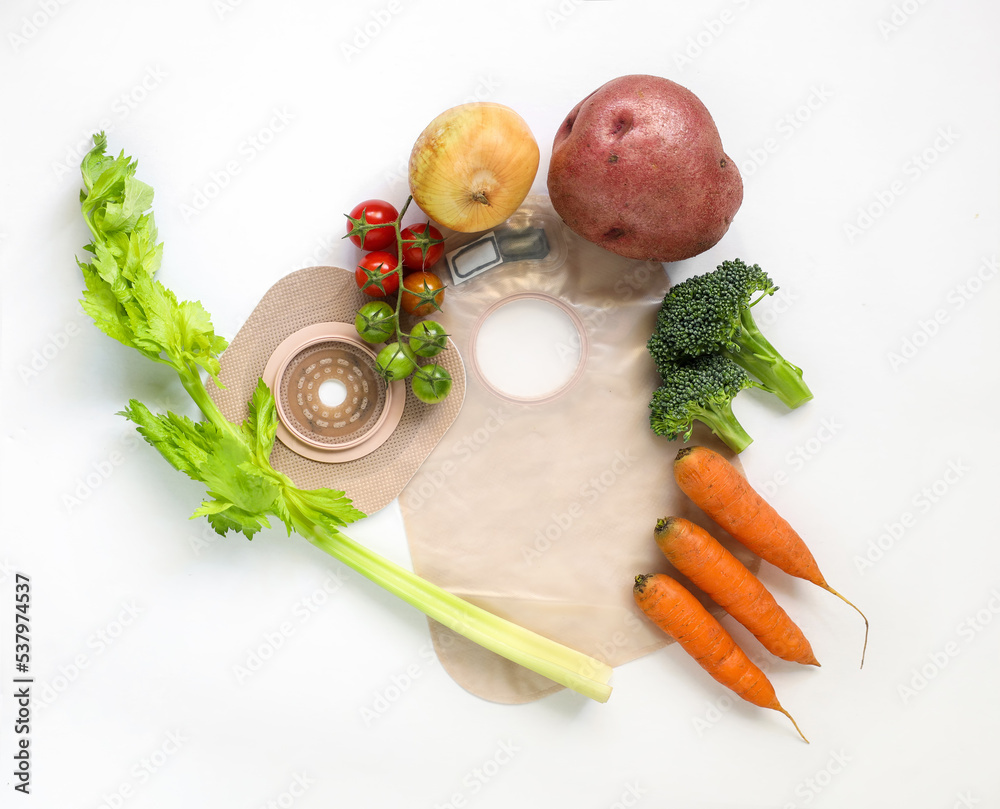 Two piece ostomy appliance including flange, pouch with vegetables isolated a white background.