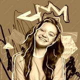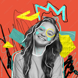 Bright happiness. Young girl's portrait with abstract graphics, lines, drawings. Contemporary art collage. Surrealism, beauty and fashion, emotions