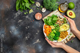 Girl holding plate with hands vegan breakfast. meal in bowl with avocado, mushrooms, broccoli, spinach, chickpeas, pumpkin. top view