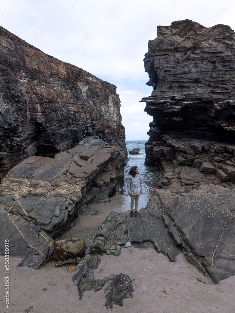 Female with rain coat stanting alone in a landscape of cliffs and rocks in low tide with the sea in the background.
