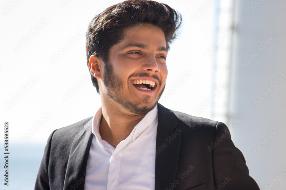 Close-up of smiling young Muslim man. Modern bearded man in black jacket and white shirt looking aside standing outdoors. Happiness and joy moments concept