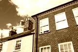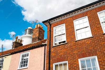 Coastal lighthouse seen rising above the roofs of terraced houses against a summer sky at a popular Suffolk coastal town.