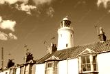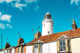 Coastal lighthouse seen rising above the roofs of terraced houses against a summer sky at a popular Suffolk coastal town.