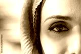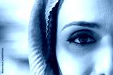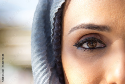Close-up of Arabian woman brown eye with beautiful make up. Young woman in grey hijab looking straight. Beauty, cosmetics and make up concept