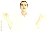 Portrait of calm young woman meditating with closed eyes. Caucasian lady wearing white T-shirt doing relaxation exercise against white background. Meditation, self-control, harmony concept