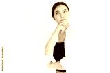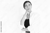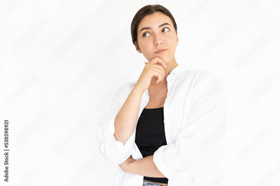 Portrait of pensive young Caucasian woman looking away. Brunette lady wearing black top and white T-shirt posing against white background. Solution and idea concept