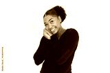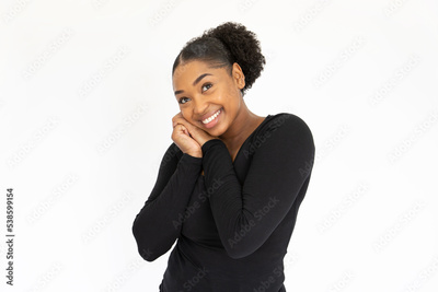 Portrait of admiring young woman posing against white background. African American lady wearing black longsleeve looking at camera with love and excitement. Admiration concept