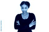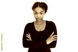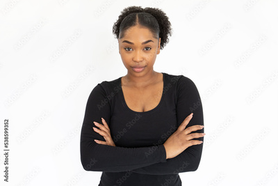 Portrait of confident young woman standing with folded arms. African American lady wearing black longsleeve looking at camera against white background. Confidence concept