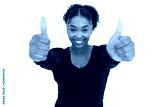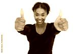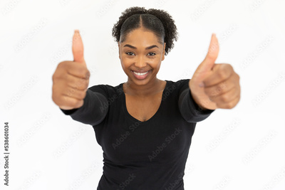 Portrait of successful young woman showing thumbs up against white background. African American lady wearing black longsleeve making like gesture, looking at camera and smiling. Success concept