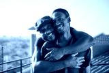 Close-up of happy African gay boyfriends looking at camera. Two bearded men in casual clothes standing together on roof top hugging taking photo on phone camera. LGBT peoples love, happiness concept