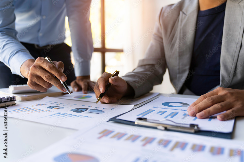 Business People Talking Discussing with concept coworker planning analyzing financial document data charts and graphs in Meetings and successful teamwork.