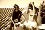 Portrait of Afro American gay couple discussing their life. Two handsome men sitting close on bench on roof top telling their problems and listening to each other. Same sex love and equality concept