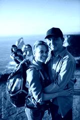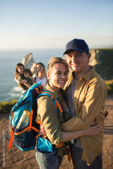 Portrait of happy couple posing with children in background. Mid adult man and woman hiking with family in summer. Active family concept