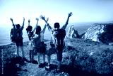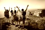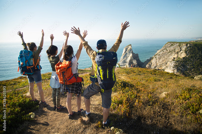 Excited family raising arms at precipice. Rear view of hiking parents with teen daughters enjoying beautiful view on mountain in summer. Active family weekend concept