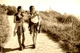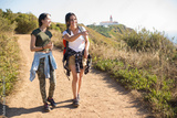 Happy teenage sisters walking in mountains. Girl pointing at view to her friend. Outdoor weekend, teen girls concept