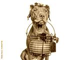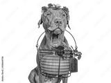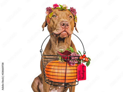 Lovely brown puppy, ripe, juicy pumpkin, lying in a metal, black basket. Closeup, indoors. Studio shot. Congratulations for family, relatives, loved ones, friends and colleagues. Pet care concept