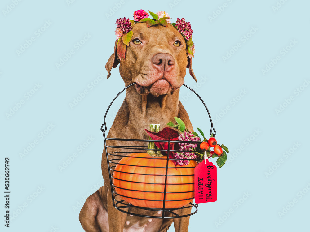 Lovely brown puppy, ripe, juicy pumpkin, lying in a metal, black basket. Closeup, indoors. Studio shot. Congratulations for family, relatives, loved ones, friends and colleagues. Pet care concept