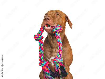 Lovable, pretty puppy and play rope. Close-up, indoors. Studio photo. Concept of care, education, obedience training and raising pet