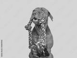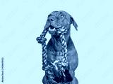Lovable, pretty puppy and play rope. Close-up, indoors. Studio photo. Concept of care, education, obedience training and raising pet