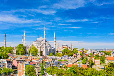 Blue mosque and Hagia Sophia in Sultanahmet district in Istanbul, Turkey. Aerial drone view