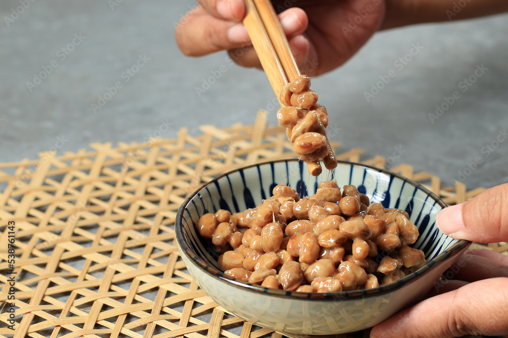 Natto in a Plate on Cement Background Lifted with Chopsticks