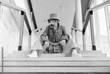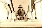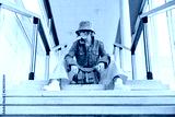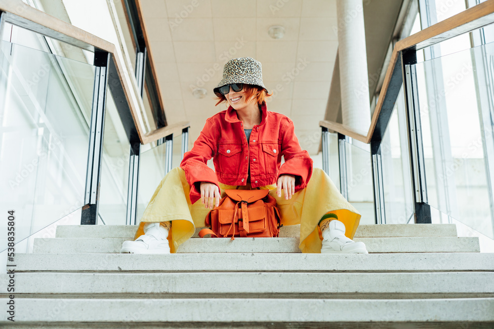 Smiling hipster young woman in bright clothes, sunglasses, backpack bag and bucket hat sitting on the stairs in public place. Urban city street fashion. Fashion blogger. Selective focus. Copy space