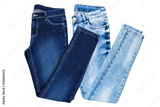 Blue jeans denim set isolated on white background with copy space. Top view and mock up clothes. Male female pants collage isolate. Autumn wear Different types clothing.