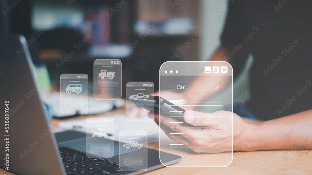 A young man searches for information to analyze in order to make a decision to buy a car,Keyword search technology concept to find information from online websites. website link search