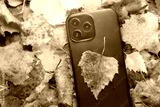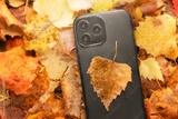 the smartphone lies on the colorful autumn foliage background. concept mobile photo of the social network. autumn journey