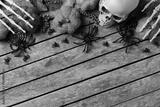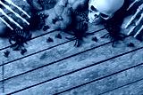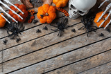 Halloween greeting card with pumpkin, skulls, bony hands and leaves