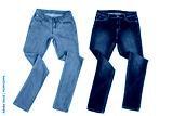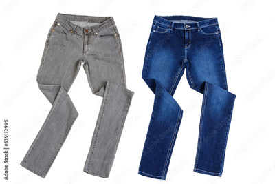 Blue jeans denim set isolated on white background with copy space. Top view and mock up clothes. Male female pants collage isolate. Autumn wear Different types clothing.