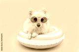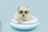 Cute pomeranian dog summer inside of an blue striped infltable ring going on vacations. Isolated on blue pastel background