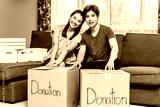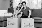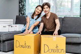 Portrait of a happy young couple packing stuff clothes, object charity in cardboard box, reused for donate, Product recycle or volunteer sharing donation concept.