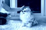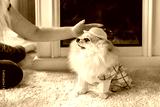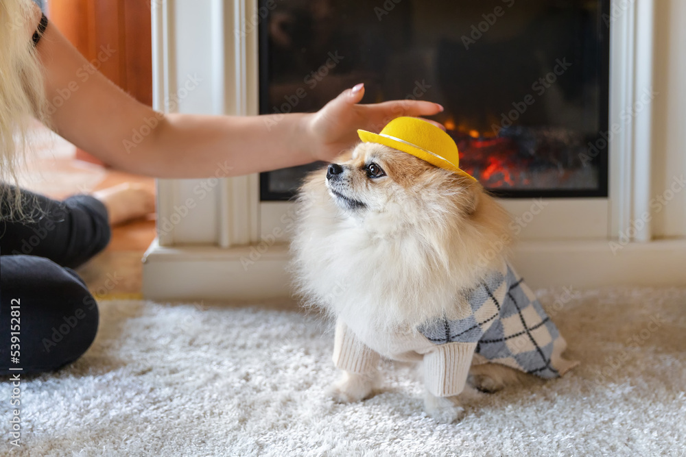 Pomeranian in a yellow hat and sweater sits near the fireplace