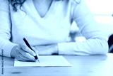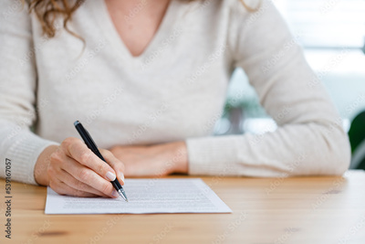 Close-up shot of an unidentifiable young woman filling out paperwork at her work desk