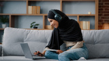 Islamic Arabian student girl Muslim woman wearing black hijab busy lady in headphones with laptop watching webinar lesson online class training write notes in notebook do homework e-learning at home