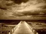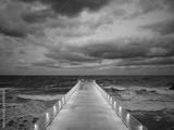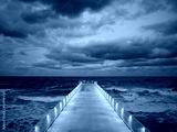 illuminated pier with dramatic sky over stormy dark sea at evening