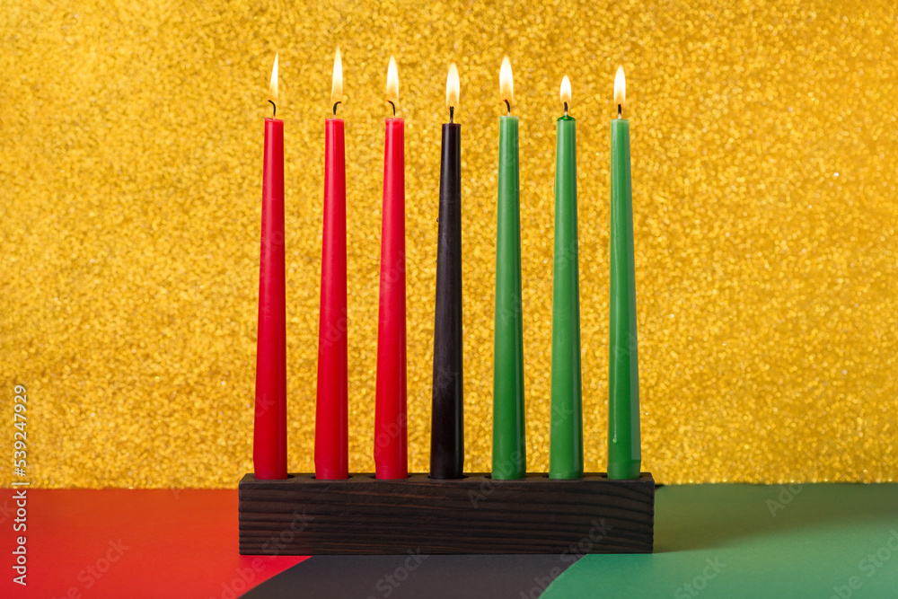 African American Kwanzaa holiday concept with traditional lit candles on symbolic background