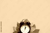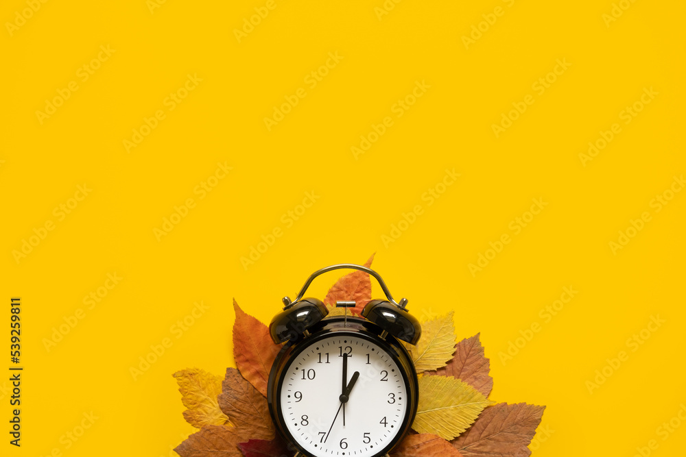 Autumn composition sale banner with dried leaves and black alarm clock on pastel yellow background. Autumn, fall Flat lay, top view, copy space