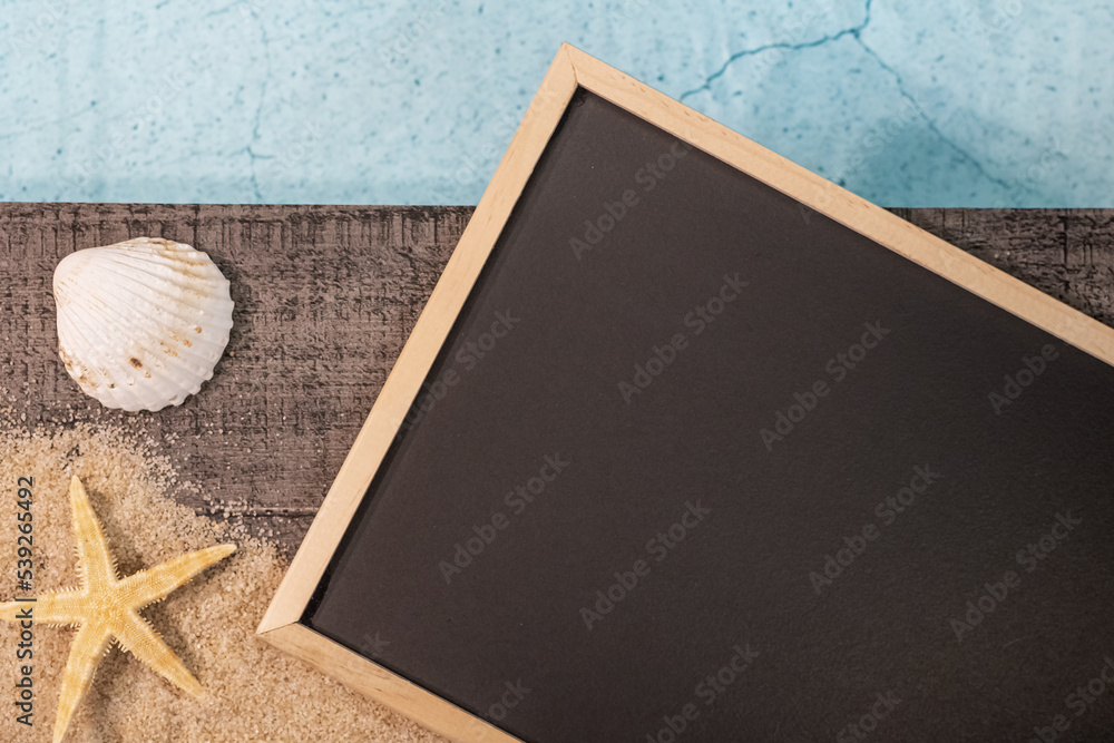 Tableau en ardoise sans inscription vu du dessus sur un dallage en bois au dessus d'une piscine avec une étoile de mer. Ambiance vacances en été.
