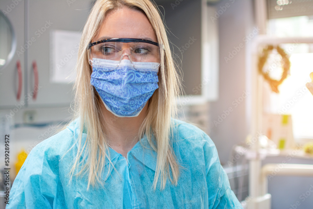 Portrait of young female dentist wearing protective suit, safety glasses and face mask while looking away in dental office.