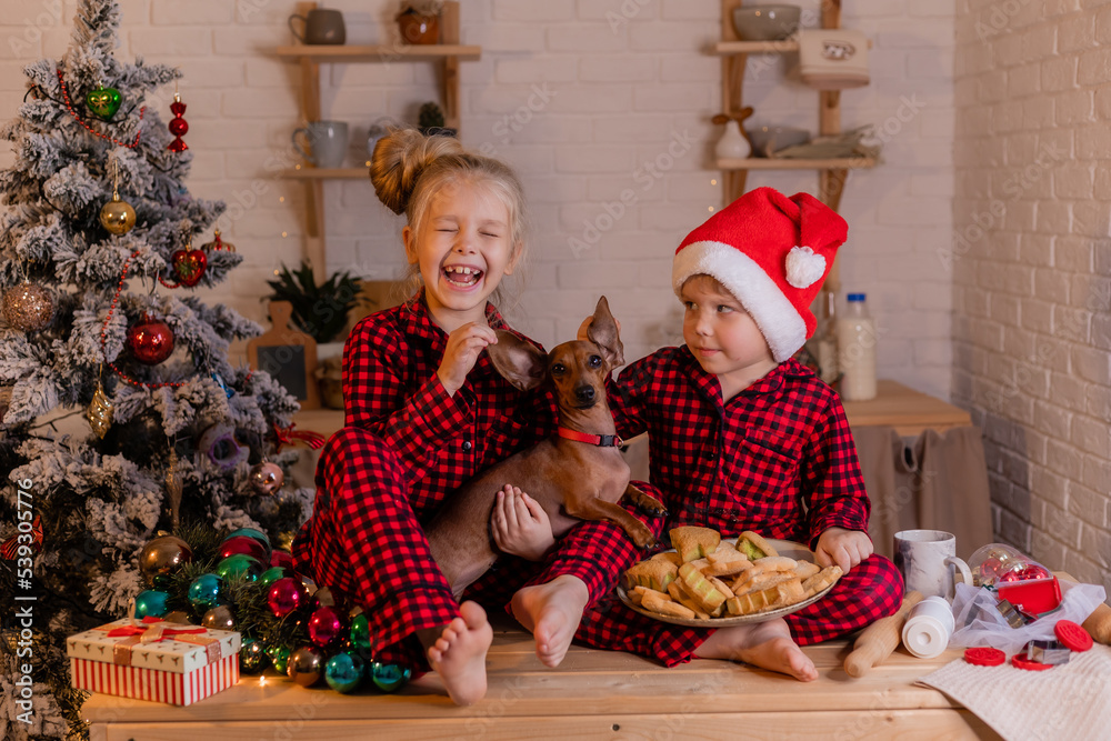 children in red pajamas and santa hats and their dog dachshund eat christmas cookies in the kitchen