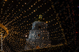 Christmas decorations and illuminated and Saint Sophia Cathedral on the background during New Year celebration in Kyiv, Ukraine