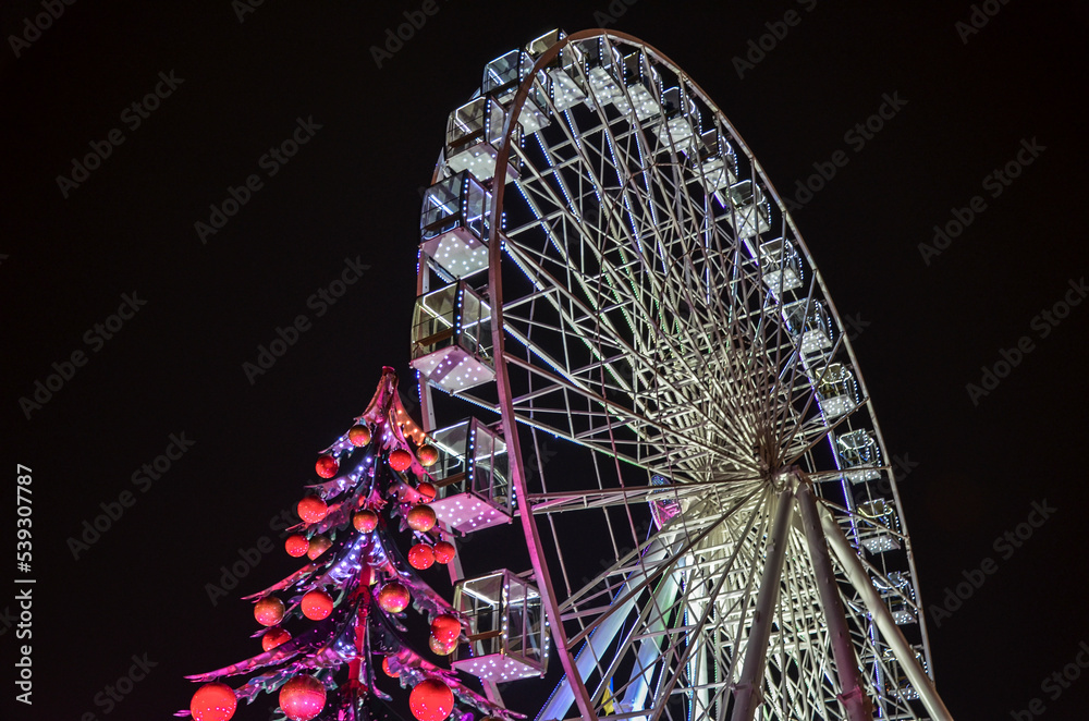 Ferris wheel and New Year tree, at traditional Christmas fair on Kontraktova Square. Winter holiday in Kyiv, Ukraine